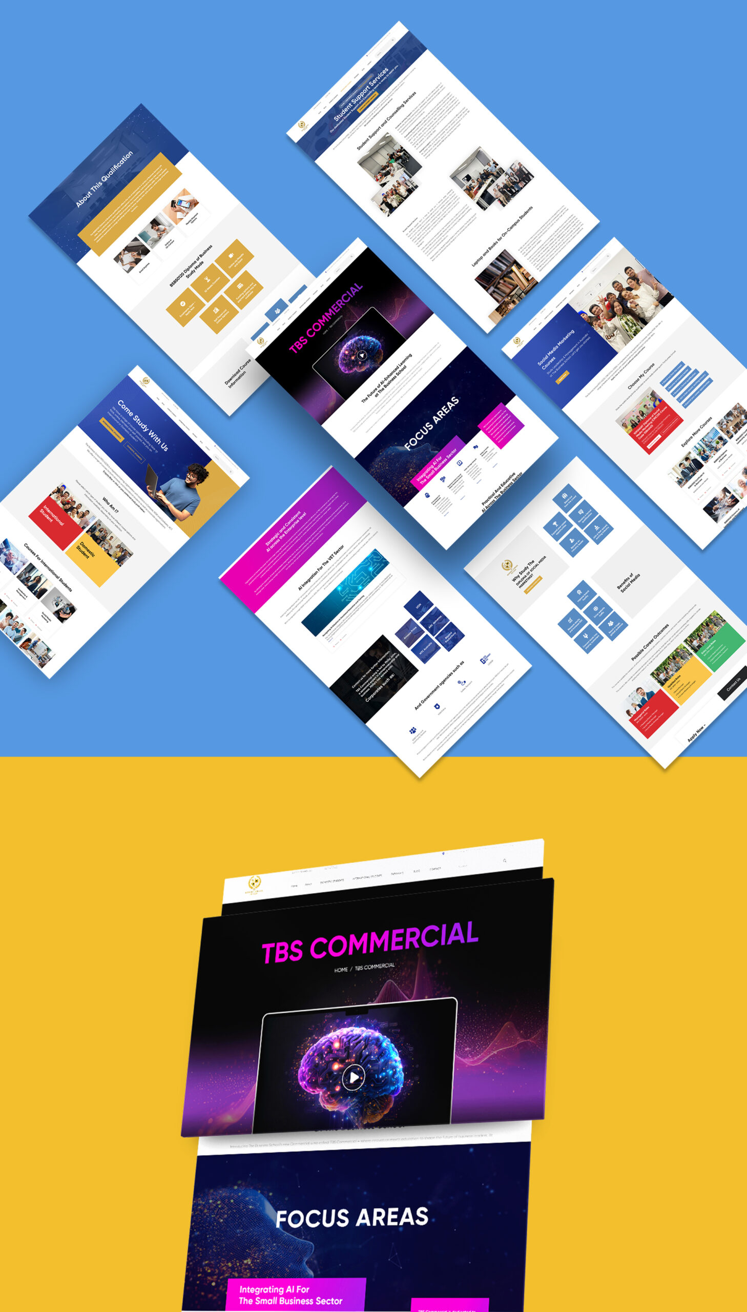 Finally, we added dynamic animations to bring their educational offerings to life. These were strategically placed across the site to feature TBS as a forward-thinking institution ready to meet the needs of modern learners.